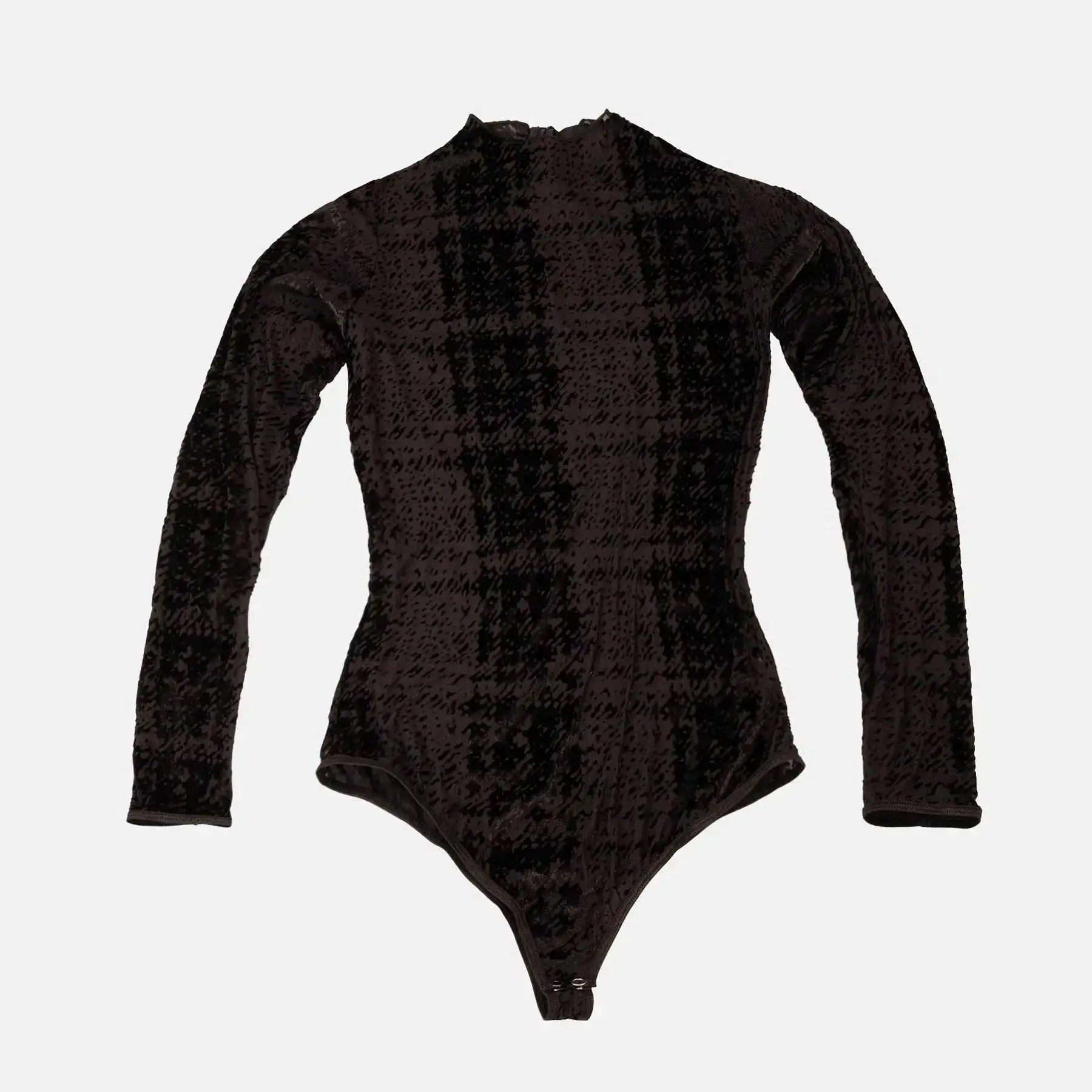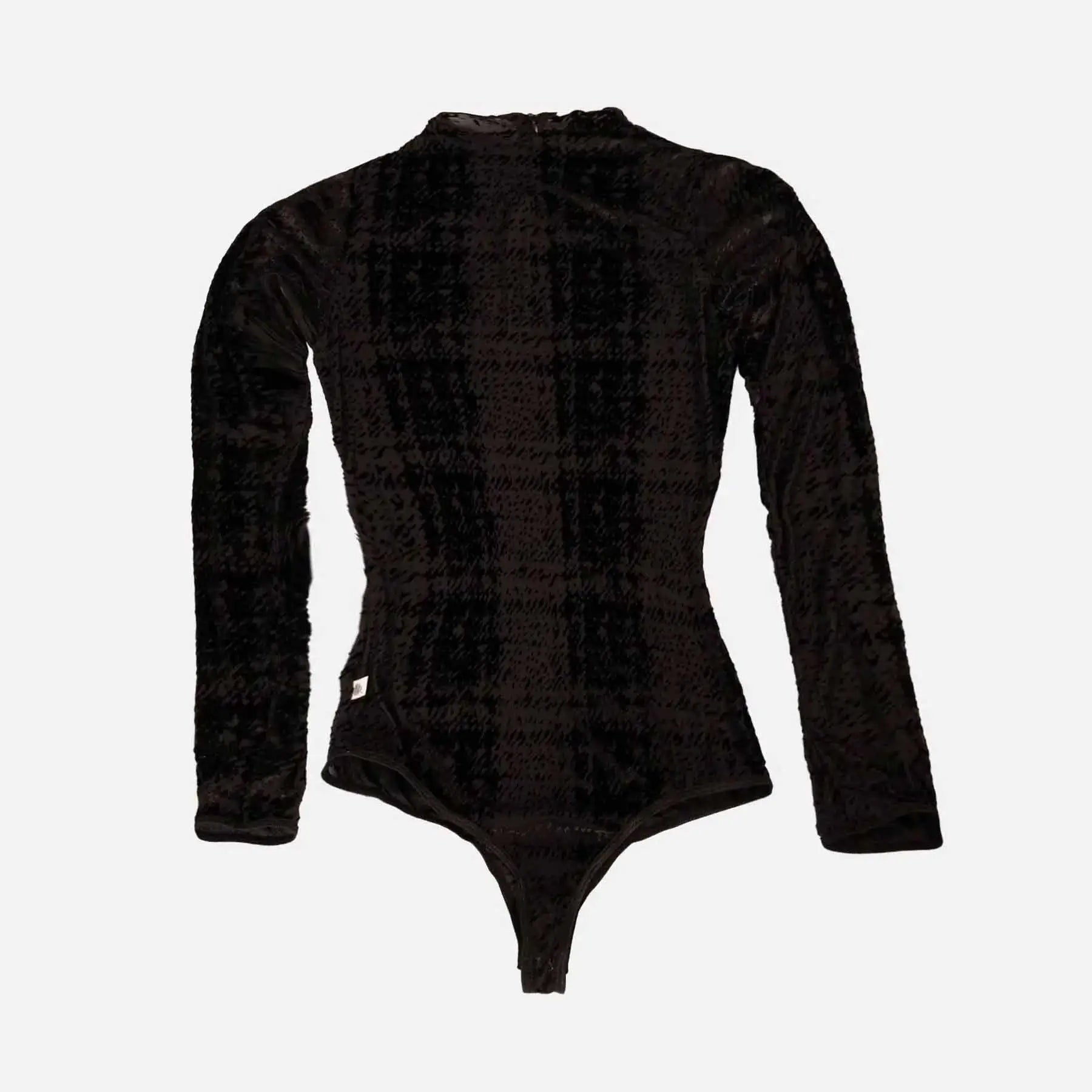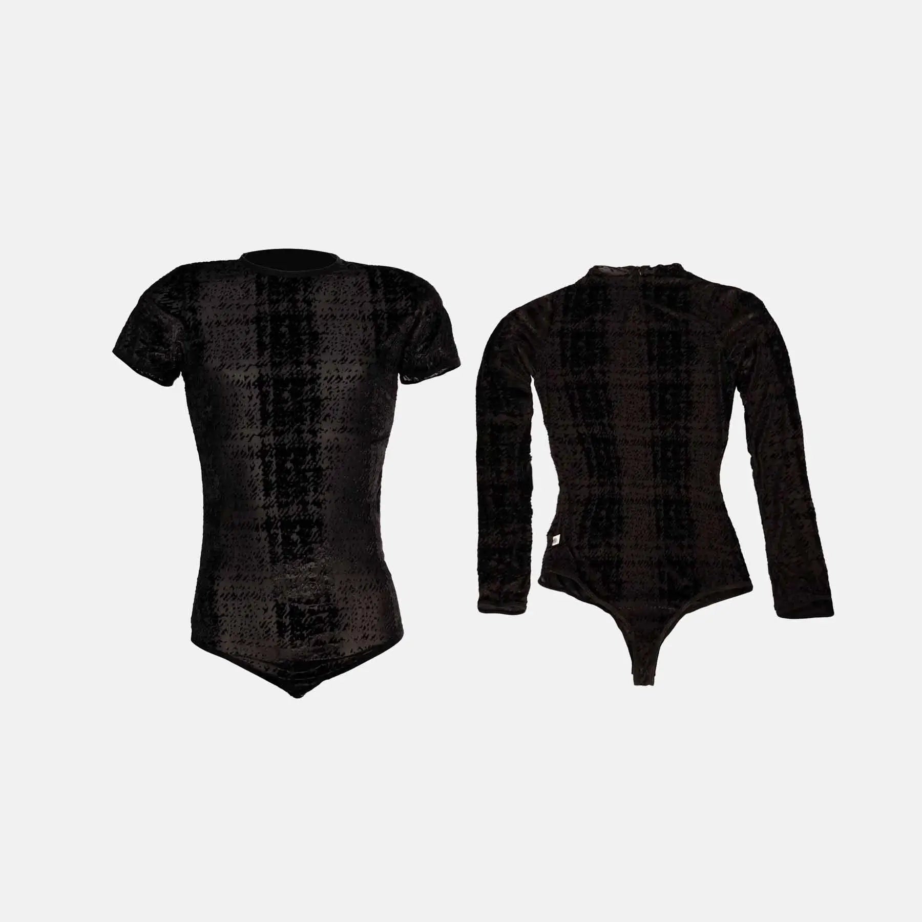 Dieses Ensemble verbindet zwei ausdrucksstarke Silhouetten: den kurzärmeligen Body Fresco mit samtigen Akzenten und halbtransparenter Netzstruktur – und den langärmeligen Body Luna di Sera mit konturiertem Design und fließender Transparenz. Beide Modelle spielen mit Licht und Struktur, betonen Formen, ohne sie vollständig zu enthüllen, und verkörpern eine elegante Balance aus Raffinesse und Stärke.
